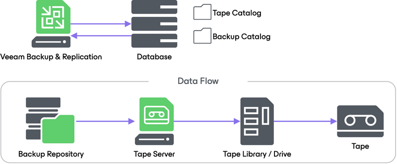 The diagram below illustrates the main components and processes within the backup infrastructure when tape support is implemented in Veeam Backup & Replication for: