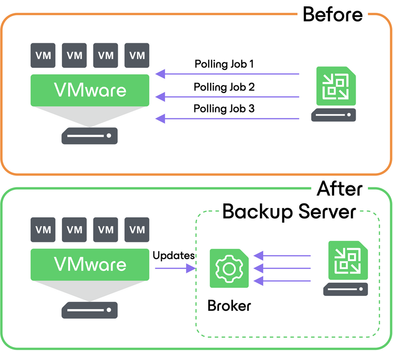 - The load against vCenter SOAP connection is heavily reduced, as we have now one single connection per Veeam server instead of each job running a new query against vCenter;